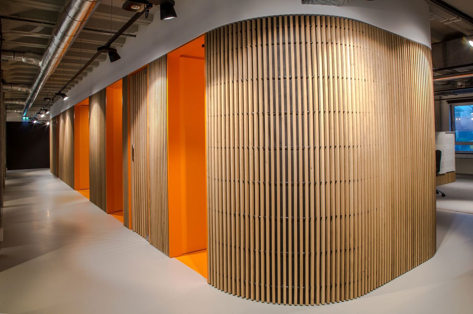 Het massief houten wandsysteem bestaat uit houten latten die met deuvels aan elkaar zijn bevestigd of houten latten die op onzichtbare achterliggende structuur worden bevestigd. De houten latten worden projectmatig in verschillende lengtes en breedtes geproduceerd. Er is een breed aanbod aan houtsoorten verkrijgbaar, allemaal met eigen kenmerken. Dankzij de keuzevrijheid bij het kiezen van de afmetingen en houtsoort, kan een unieke wand worden gecreëerd.