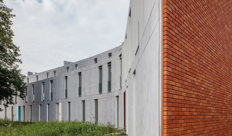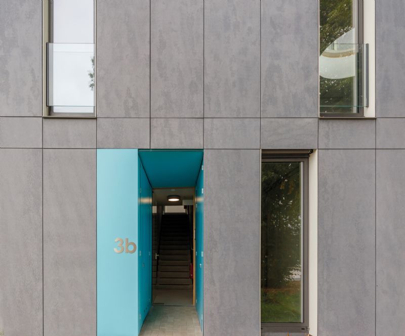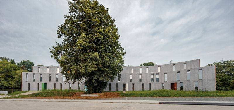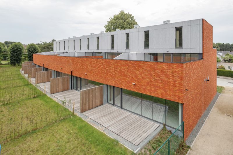 Het project beoogt een verdichting van de dorpskern (inbreiding) door het creëren van zo veel mogelijk woongelegenheid. De cluster van 16 compacte woongelegenheden maakt een zachte kromming naar de achterkant van het terrein, om de lindebomen langs de straatkant te behouden. De langsgevels zijn bekleed met EQUITONE [tectiva] TE 15. De grafiek van deze panelen geeft het gebouw en het voorliggende plein een neoclassicistische allure.