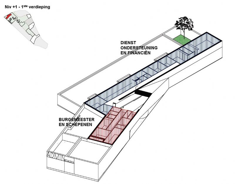 In een geplande groenomgeving bouwt gemeente Staden een nieuw administratief- en dienstencentrum voor het personeel van gemeente Staden en het OCMW. Het gebouw staat volledig in relatie tot het park, de nieuwe assistentiewoningen liggen een stuk van de parking af waardoor bewoners en bezoekers altijd een korte wandeling moeten doen. Volt architecten uit Gent won de open oproep.