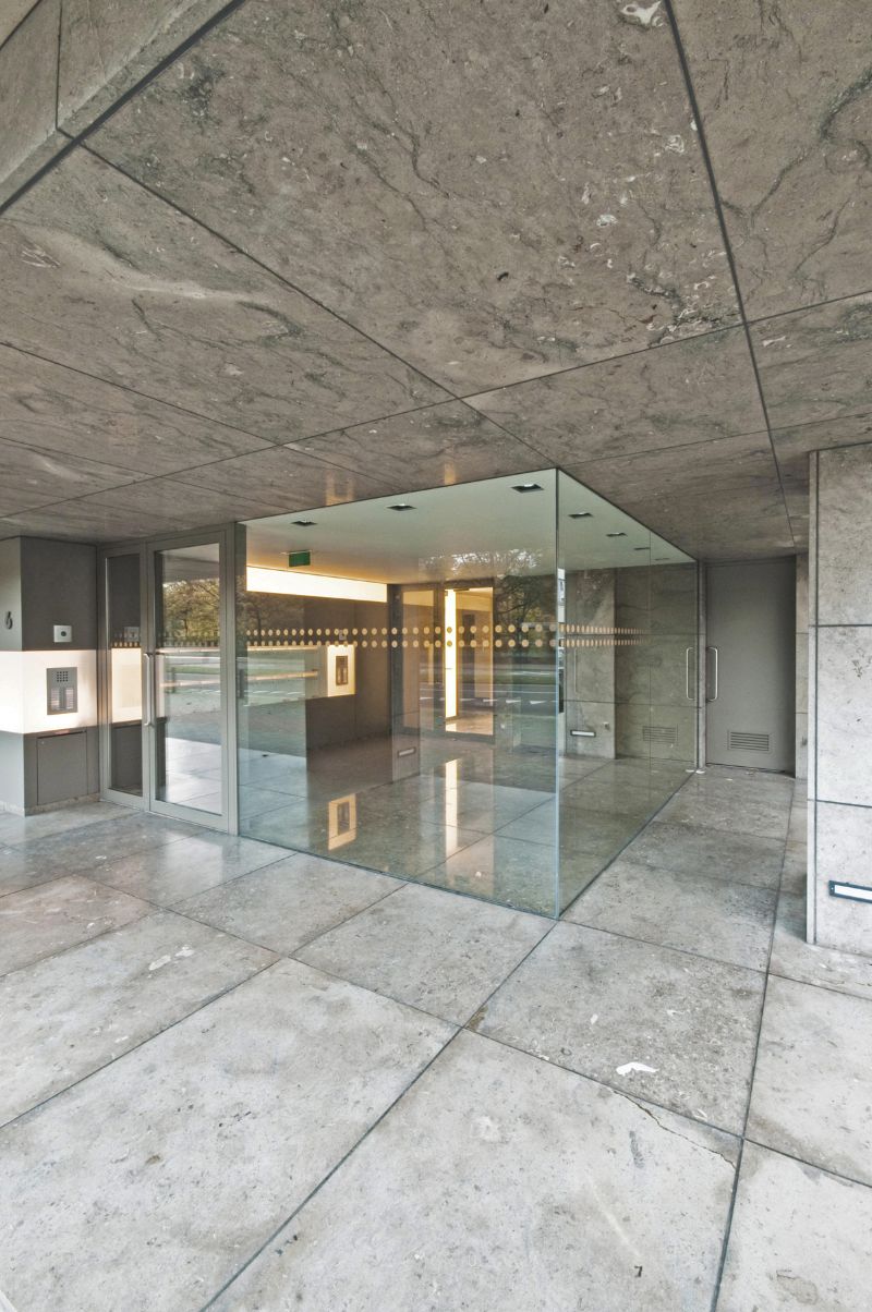 Een gelijmde structurele kamerbrede beglazing en glazen borstweringen aan de binnenzijde, zorgen voor een optimale transparantie en een adembenemend zicht op het stadspark.