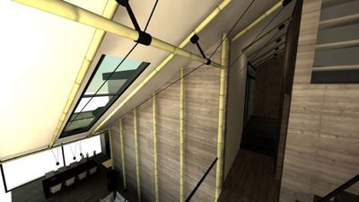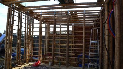 CRU! Architecten maakte het ontwerp voor een woning en een kantoor-atelier in bamboe waaraan momenteel volop gebouwd wordt. Het vernieuwende zit hem daarin dat bamboe bij dit project niet alleen als gevelbekleding maar ook als constructiemateriaal gebruikt wordt. Voor isolatie van zowel muren, dak als vloeren is het gehele skelet met kalk-hennep bedekt, wat een grote ecologische meerwaarde biedt aangezien het geheel meer CO2 opneemt dan uitstoot. De bouwwerken lopen nog tot februari 2016.