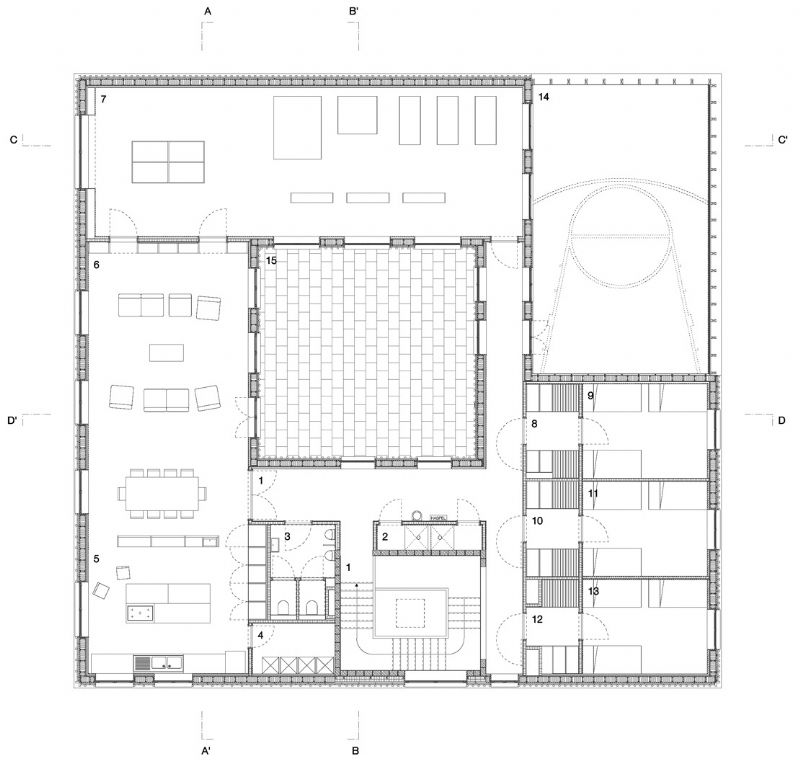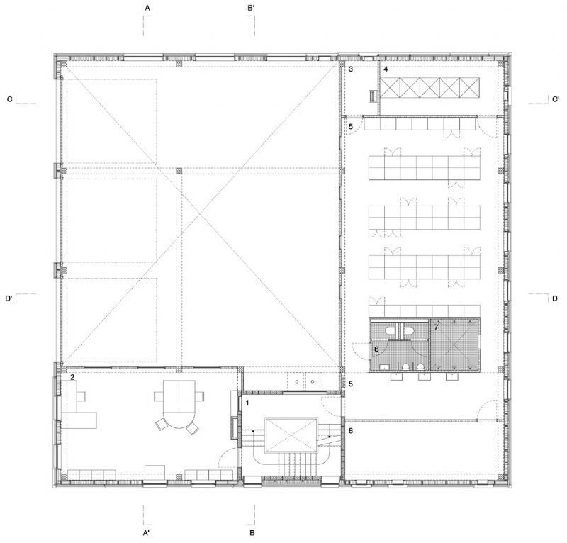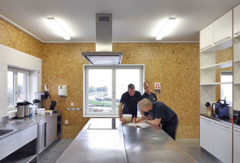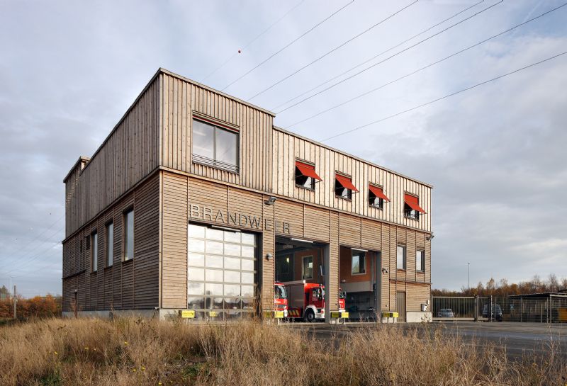 Een brandweerkazerne verenigt een publieke missie met een woonopgave. Deze brandweerkazerne is een loods met daarop een huis. Midden in het huis biedt een patio wat beschutting in de rauwe omgeving van de Antwerpse haven. Het gebouw bestaat grotendeels uit hout: een weloverwogen keuze.