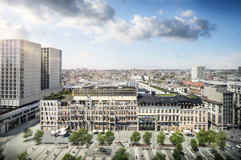 De voormalige Allianz-kantoren, die uitkijken op het De Brouckèreplein in Brussel, worden omgebouwd tot een gemengd project dat kantoren, winkels, een hotel, appartementen en studentenkoten combineert.