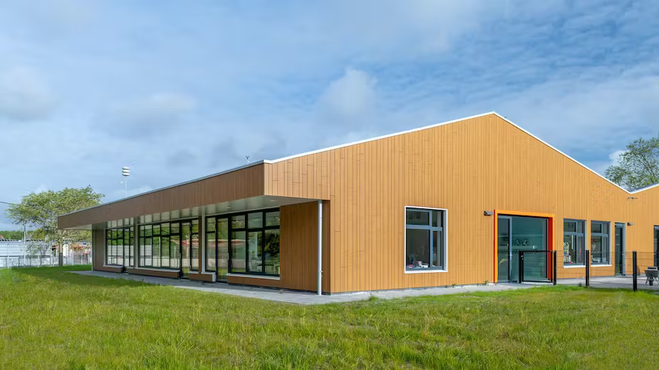 Het nieuwe kindcentrum De Dobbe in Roodeschool is vanwege de gaswinning en het risico op aardbevingen in Noordoost-Groningen aardbevingsbestendig gebouwd. Architectenbureau bct architecten uit Enschede koos een ontwerp dat aan deze eisen voldoet dankzij een eenvoudige constructie en lichte materialen. De keuze voor duurzame gevelbekleding van Rockpanel Woods is een schot in de roos.