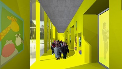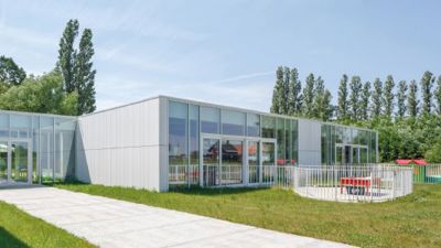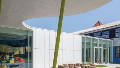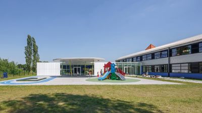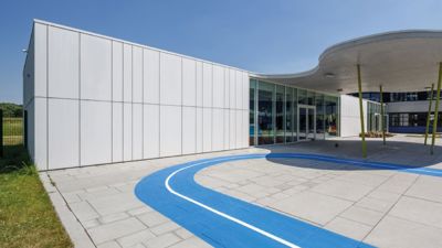 De opdracht was om een uitbreiding van de lagere school te bouwen met twee kleuterklassen en een verbindingsgang. De architecten vertrokken vanuit de reeds bestaande paviljoentypologie bij de keuze van de gevelpanelen. Ze zochten binnen dat concept, naar een bepaalde “clean”-heid. Op de tweede plaats was er de nood aan een gevelbekleding die duurzaam is. De witte, in de massagekleurde EQUITONE [natura] voldeed aan de vereiste eigenschappen.