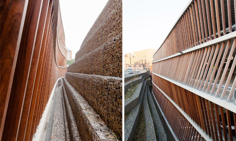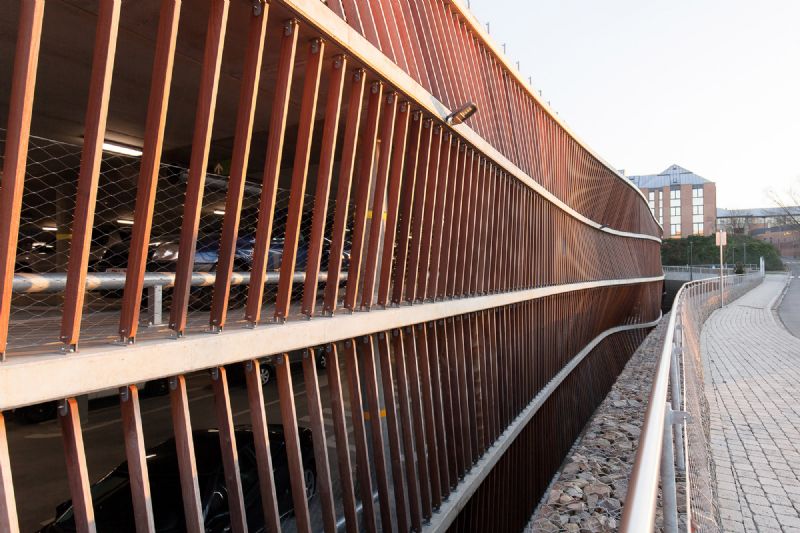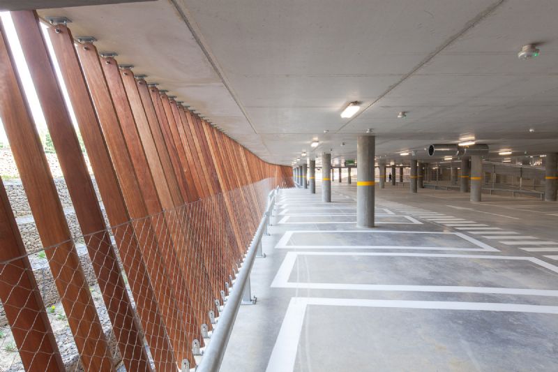 Modulo Architects en de Jong Gortemaker Algra realiseerden een parkeergebouw met 985 plaatsen voor het Universitair Ziekenhuis Saint-Luc in Sint-Lambrechts-Woluwe. Deze parkeergarage is zowel helder als aantrekkelijk en structureert tegelijkertijd de locatie met een geraffineerde landschappelijke inpassing. De golvende gevel in hardhouten lamellen geeft het parkeergebouw een warme uitstraling.