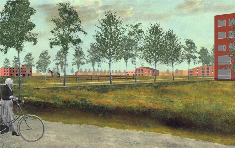 Voor de bebouwing wordt vertrokken van een agrarisch raster van velden en bomen. Op dit raster worden nieuwe bomen aangeplant, wat leidt tot een voorsprong van het landschap op de bebouwing. Het resultaat is een robuust raster, dat op termijn ‘verstedelijkt’. Er ontstaat een evolutie van agrarische velden en bomenrijen naar landschapskamers met bebouwde randen. De juiste maat en schaal van deze velden is heel belangrijk om landschappelijk wonen in een stedelijke dichtheid te realiseren. Een te kleine maat zorgt voor versnippering en gebrek aan landschappelijk gevoel, een te grote maat van de velden leidt tot lage woningdichtheden.