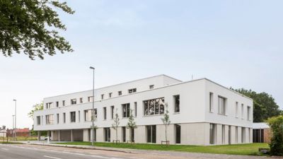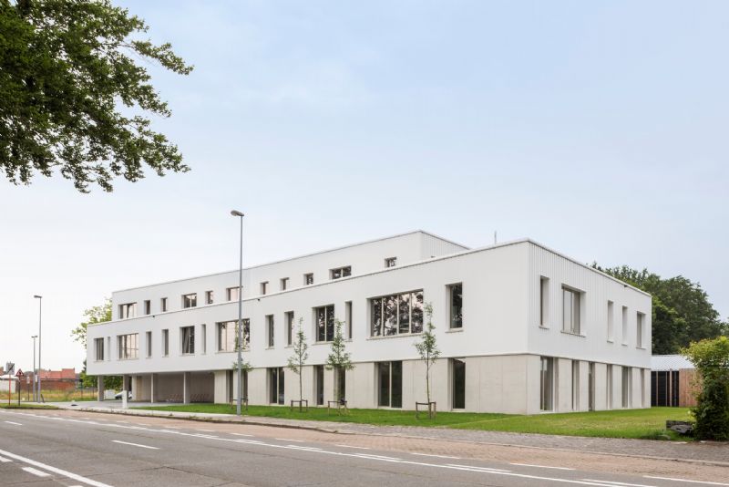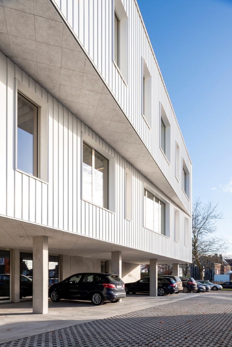 Architect Gino Debruyne: “Het nieuwbouwvolume vertrekt van een duurzame conceptvisie voor een aanpasbare invulling van kantoorfuncties voor directie en medewerkers. Het vrijstaand nieuwbouwvolume op de hoek van de Spoorwegstraat en de Groene Poortdreef ontwikkelt zich over twee bouwlagen en een accentvolume. Het gebouw is opgetrokken uit een modulaire schil in witgelakte geprofileerde staalprofielen van SAB-profiel (NL), specifiek ontworpen voor dit project.”
