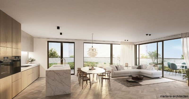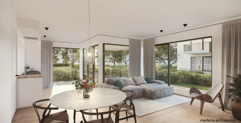 Omdat alle appartementen zich bevinden op de hoeken van de bouwvolumes, profiteren de leefruimtes van een dubbele oriëntatie met spacieus privéterras en vergezicht op het aangelegd park met kleurrijke bloemperken, inheemse boomsoorten en grasdallen.