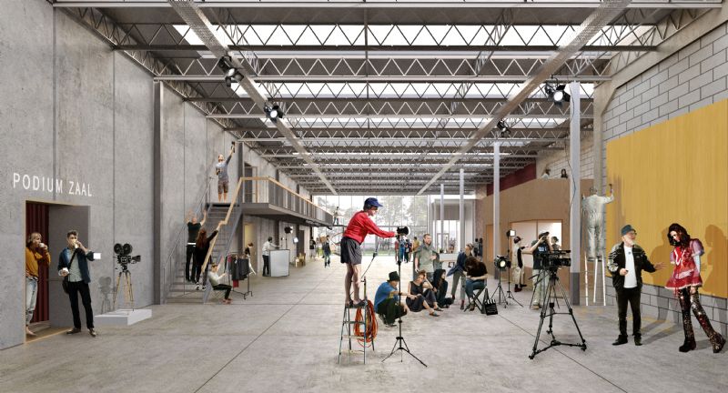 TRANS architectuur | stedenbouw ontwerpt i.s.m. V+ een nieuwe film- en theaterstudio voor het RITCS in Brussel. Het nieuwe volume wordt aangevuld met een overdekte galerij die ontmoeting op de campus langs het kanaal in Brussel mogelijk maakt. De magazijnen in het bestaande gebouw worden heringericht als repetitiestudio’s. Om zo veel mogelijk te kunnen investeren in de technieken, hebben TRANS en V+ de ruwbouwkost sterk beperkt zonder in te boeten op uitstraling en kwaliteit. Het resultaat is een ruwe betonnen structuur met een opvallende omlijning in nobele materialen, een interessant silhouet langs het kanaal.