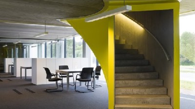 Het Vlaams netwerk van ondernemingen Voka in West-Vlaanderen nam recent zijn intrek in “Villa Voka” in Kortrijk. Een architecturale parel waarin alle regionale afdelingen zijn samengebracht. Lucht, licht en groen faciliteren optimaal het huiselijke kantoorleven. Het slanke en ranke gebouw is van het ontwerpteam Bureau Goddeeris Architecten i.s.m Office Kersten Geers David Van Severen. Zij waren de uitverkorenen om langs de President Kennedylaan een gloednieuw kantoor te ontwerpen. Een opsteker voor Voka is dat Office met Kersten Geers, David Van Severen en de fotograaf Bas Princen op de Biënnale in Venetië aan de haal gingen met de Zilveren Leeuw voor de categorie ‘beloftevol talent’. Het resultaat van het project in Kortrijk is ronduit verbluffend. Vooral dan door de sierlijke toepassing van beton, aluminium en glas, materialen die het gebouw transparant maken en tegelijkertijd een heldere constructieve logica etaleren. Aan de buitenkant schiet de blik door het gebouw dat aan de zuidkant slim gefilterd is door stalen roosters. Ze omkleden het gebouw als fijne tule. Fragiliteit en transparantie gaan hier hand in hand. De gele en rode betonnen trapkokers zorgen ongetwijfeld voor een levendige en kloek tricolore-effect. Aan de buitenkant is te zien hoe deze trappen zich als een lenig lint door het gebouw slingeren. Hoe meer men kijkt hoe meer details het oog ontdekt. Details maken het verschil. Zoals de gordijntjes die mee in het concept werden opgenomen en licht en geluid temperen maar daarnaast een beweeglijk visueel accent vormen. Als men het gebouw van op afstand bekijkt lijkt het alsof het op een dag als een zeppelin hier geruisloos is neergestreken.
