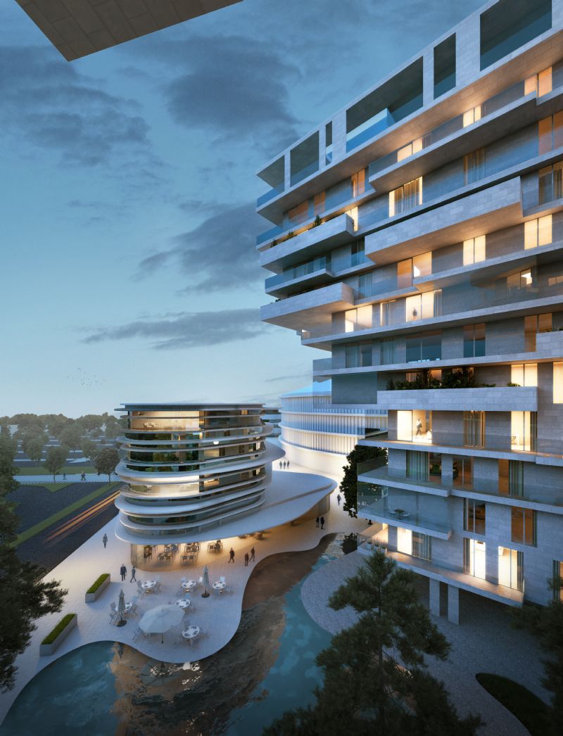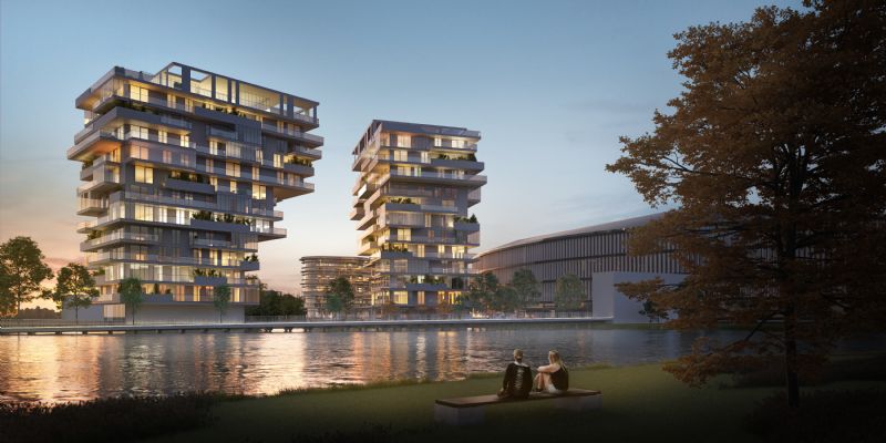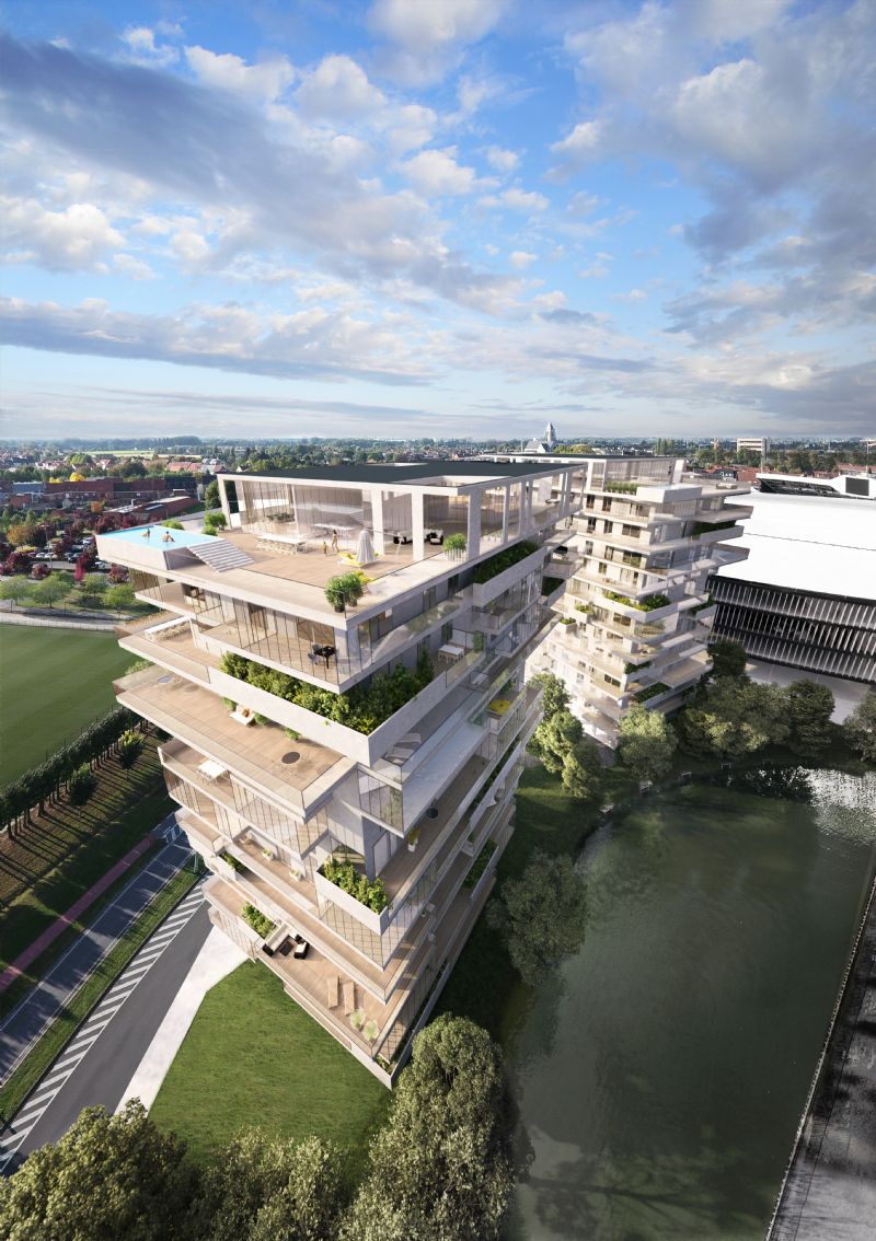 De omgeving rond de Elindus Arena, gelegen tussen het Regenboogpark en de zuidelijke binnenring van Waregem, heeft een spectaculaire transformatie ondergaan. Onder de noemer Waterfront herschiepen B2Ai architects en Wielfaert architecten het onbestemde gebied tot een levendig nieuw stadsdeel dat een mix van functies verenigt. Voor het hoogtepunt tekenen twee woontorens die zich presenteren als een abstracte Y-vormige sculptuur. Met hun grillige gevels in natuursteen en gekartelde terrassen symboliseert het duo de nieuwe poort van Waregem. Samen met een paviljoenachtig hotel en kantoorgebouw vormen de nieuwe torens de iconische brug tussen zuidrand en het centrum van Waregem.