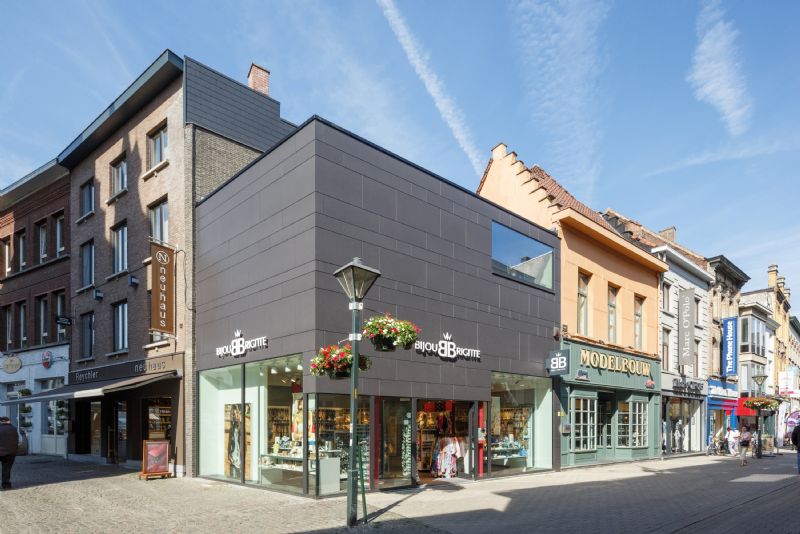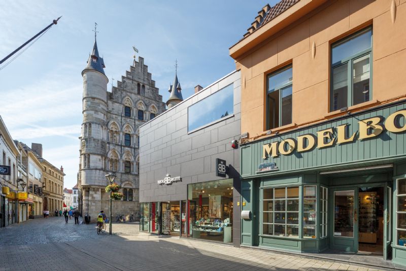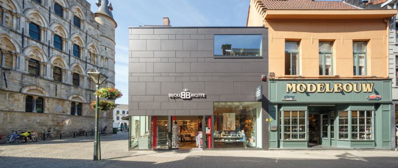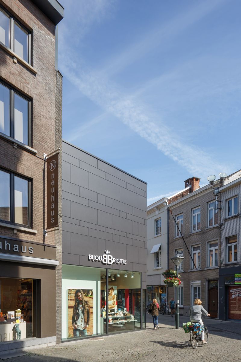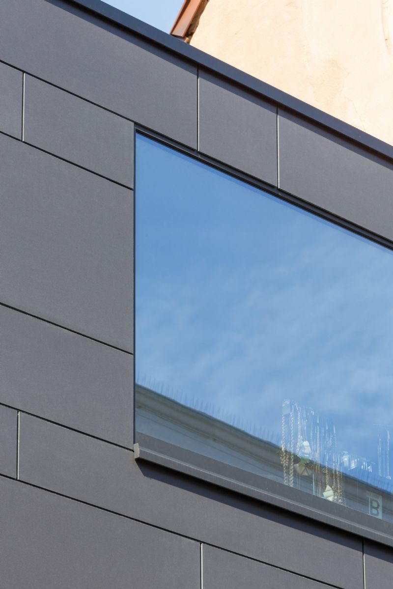 Strak, modern en tijdloos. Een zwarte doos. Onderhoudsvriendelijk. Er werd gezocht naar een contrast tussen de architectuur uit de 15de eeuw en de 21ste eeuw. Oud en nieuw rechtover elkaar zonder dat ze mekaar storen. De EQUITONE gevelpanelen waren uitermate geschikt om het karakter van dit gebouw nog meer te accentueren. Een spel van verschillende paneelformaten zowel horizontaal als verticaal was het uitgangspunt in dit ontwerp.