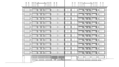 Het concept neemt als startpunt het herinterpreteren van de bestaande architectuur. Voor deze reden zal de façade opnieuw geïsoleerd en ingepakt worden met nieuwe prefab betonelementen in combinatie met nieuwe ramen met ruime glasvlakken en sterk gearticuleerde raamkaders om zo tot een nieuwe architecturale lezing van de gebouwen te komen. Variërende massa, kleur en belijning van het beton zoeken een herinterpretatie van het decoratief patroon van de originele façade.Om terug tot een elegante gevel te komen is - paradoxaal - de gevel gesimplificeerd en robuuster.