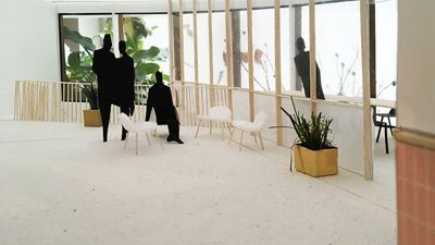 ZAmpone, in samenwerking met Madam Architectuur, kiest voor een nieuwbouw discreet tussen de bestaande gebouwen. Twee balken, twee bouwlagen. Maar niet overal. Het spel met bouwlagen laat de bestaande weg passeren en creëert een overdekte parkeergelegenheid maar ook en vooral ontstaat er zowel een geborgen daktuin als weidse uitzichten. Het nieuwe dagcentrum komt tussen de schuur en het huidige dagcentrum.De leefgroepen nestelen zich op de verdieping. De leefruimtes bestaan uit twee verschillende georiënteerde maar gekoppelde delen: gevariëerde ruimtelijke beleving gekoppeld aan hoekjeswerking en huiselijke schaal.