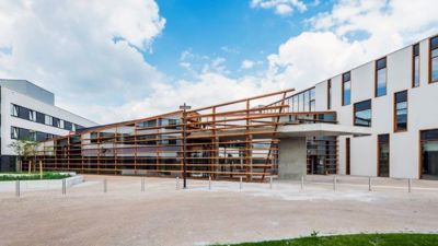 Het in het oog springende cortenstaalkunstwerk in de voortuin liegt er niet om: het nieuwe Ziekenhuis Maas en Kempen in Maaseik is een uniek staaltje zorgbouw. Een transparante inkompartij verbindt vier blokken met een eigen structuur, functie, afwerking en identiteit. Het resultaat is een ‘healing environment’ die gezien de beperkte bouwhoogte van het geheel optimaal geïntegreerd is in de groene omgeving.
